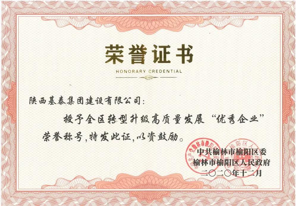 3月3日,在榆陽區(qū)第十八屆人民代表大會第七次會議閉幕會上,區(qū)委、區(qū)政府對授予全區(qū)轉(zhuǎn)型升級高質(zhì)量發(fā)展的30戶“優(yōu)秀企業(yè)”進(jìn)行了表彰。陜西基泰集團(tuán)建設(shè)有限公司被中共榆林市榆陽區(qū)委、榆林市榆陽區(qū)人民政府授予全區(qū)轉(zhuǎn)型升級高質(zhì)量發(fā)展“優(yōu)秀企業(yè)”榮譽(yù)稱號。