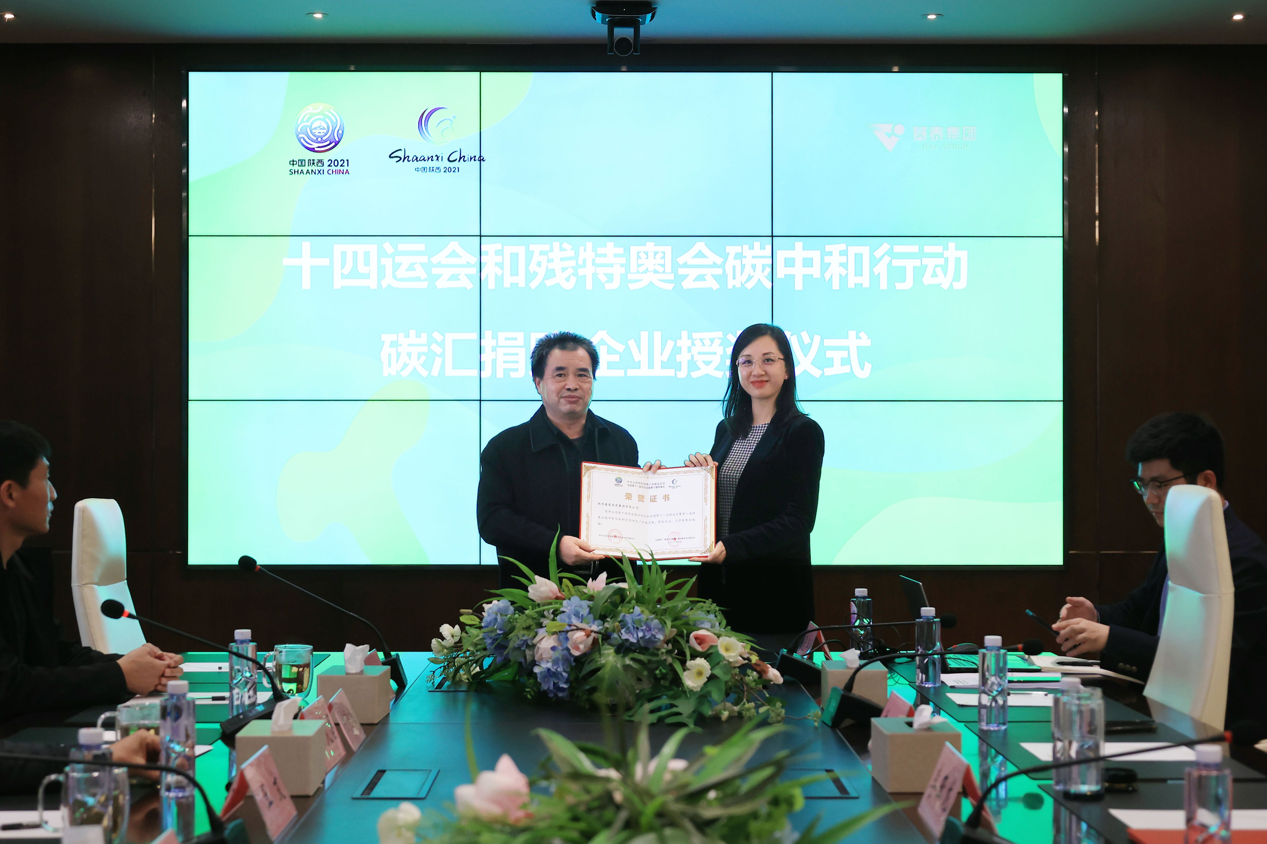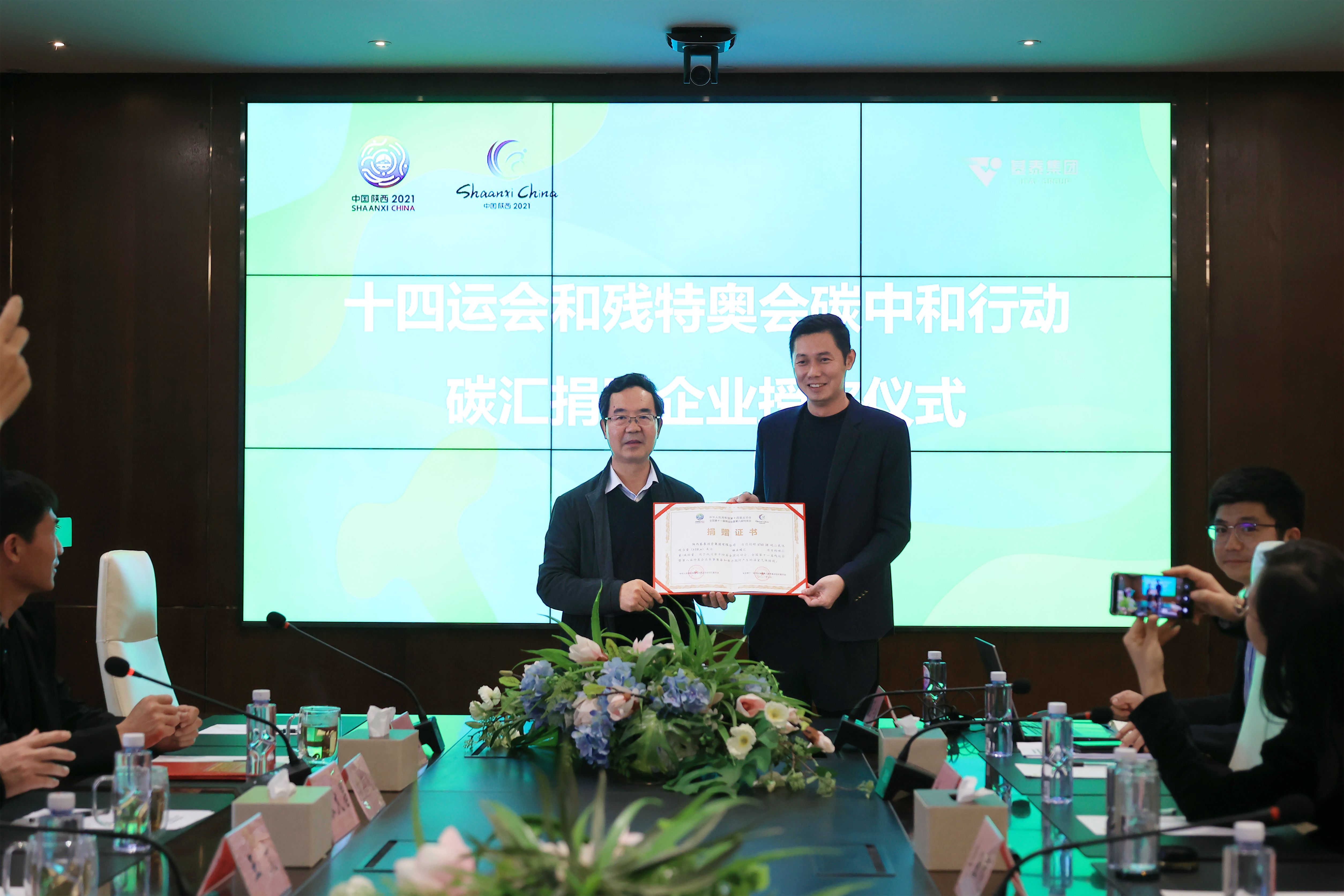 王文為基泰集團(tuán)頒發(fā)“十四運(yùn)會(huì)和殘?zhí)貖W會(huì)碳中和行動(dòng)捐贈(zèng)證書”。