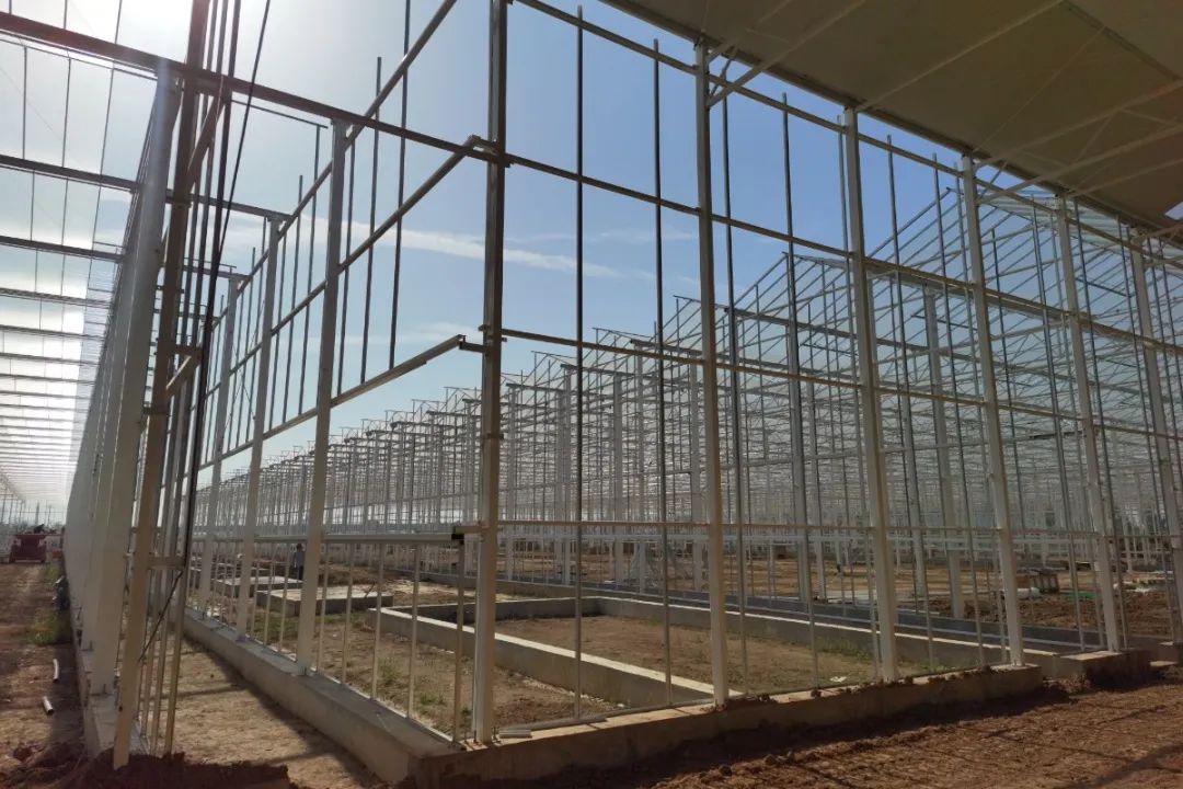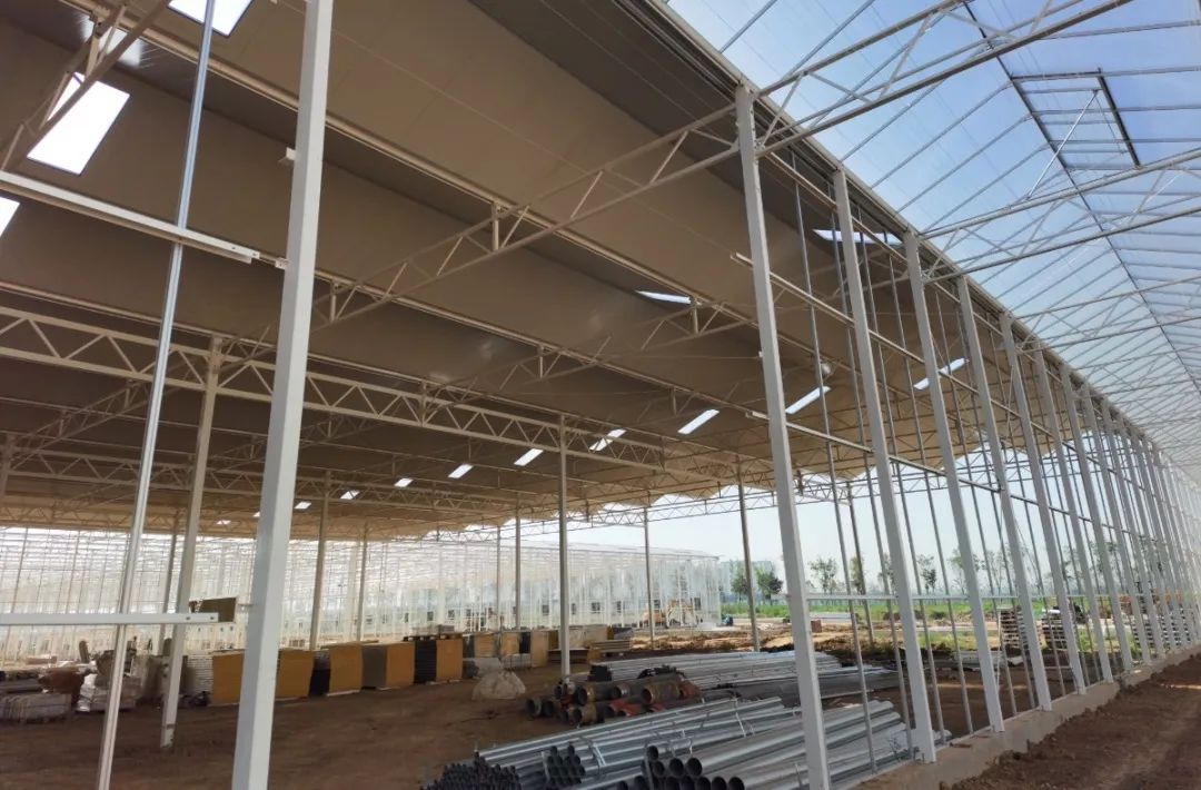 截止目前,玫瑰鮮切花溫室30720㎡和紅掌鮮切花溫室19668㎡主體結(jié)構(gòu)、頂部及立面玻璃覆蓋、三層網(wǎng)托壓幕線、暖通工程及給排水工程地下管網(wǎng)、CO2補充系統(tǒng)等已完成安裝,溫室頂開窗傳動系統(tǒng)完成80%、內(nèi)遮陽內(nèi)保溫鋼纜驅(qū)動系統(tǒng)完成70%。玫瑰溫室半封閉結(jié)構(gòu),紅掌溫室濕簾及負(fù)壓風(fēng)機等已完成安裝。