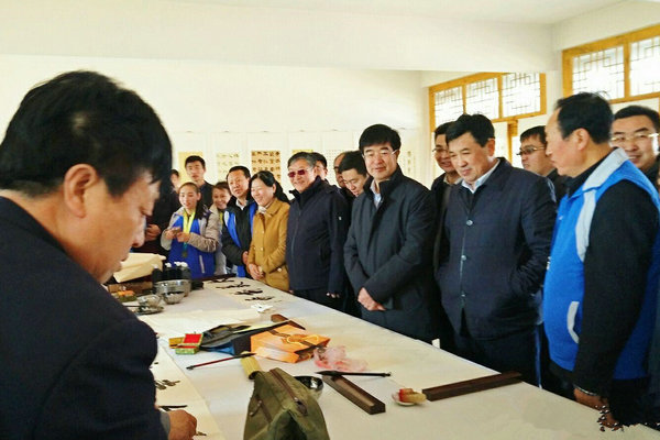 基泰路橋公司總經(jīng)理李學(xué)彥(右三)陪同苗豐書記參觀了書畫展、書法現(xiàn)場筆會、攝影展、文藝演出、常樂堡老年幸福院等,并為牛家梁鎮(zhèn)評選出的十個“十佳”稱號獲得者頒獎。